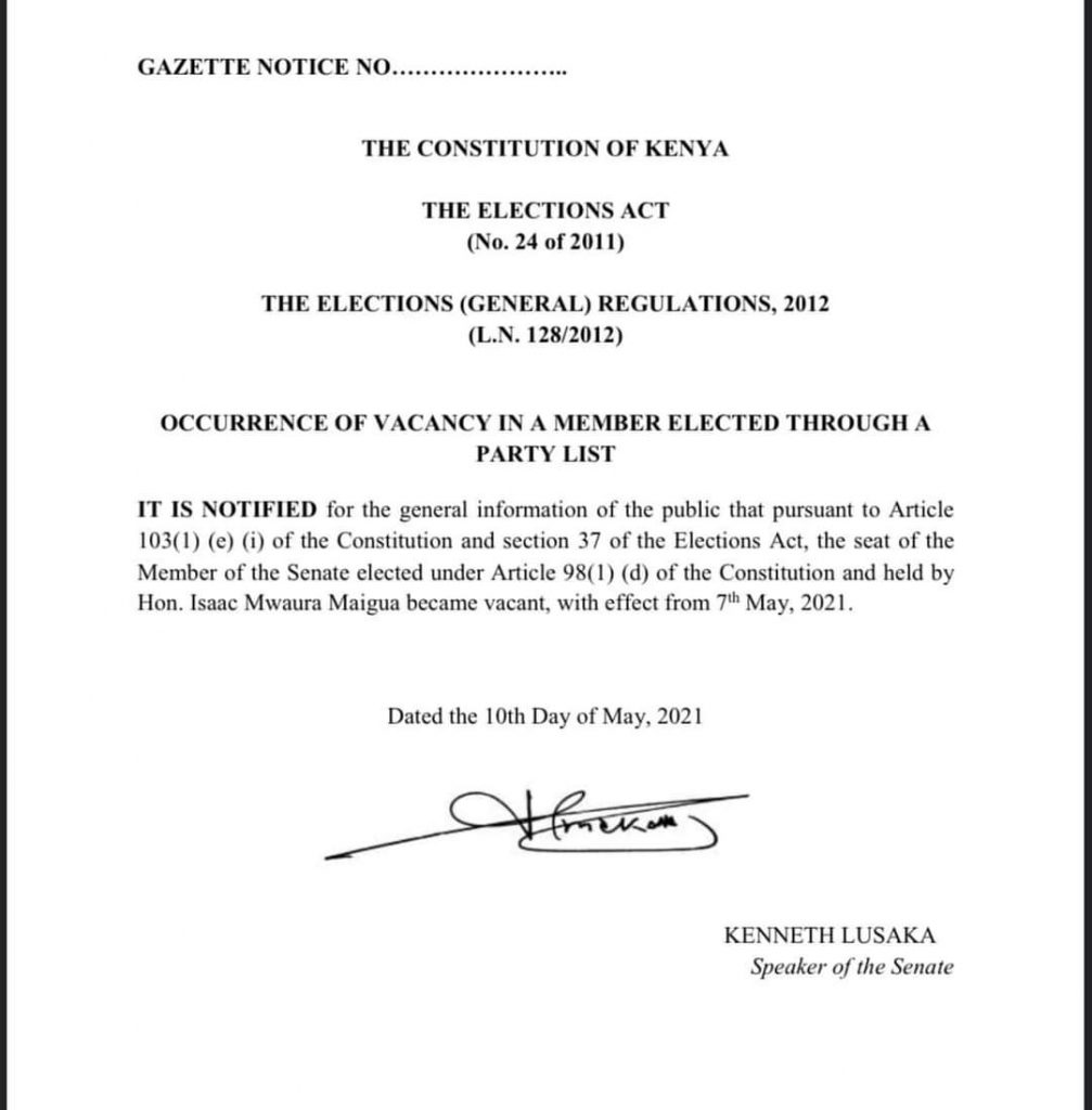 Nominated Senator Isaac Mwaura has lost his Senatorial seat after Speaker Kenneth Lusaka gazetted the position as vacant with effect from May 7 2021.