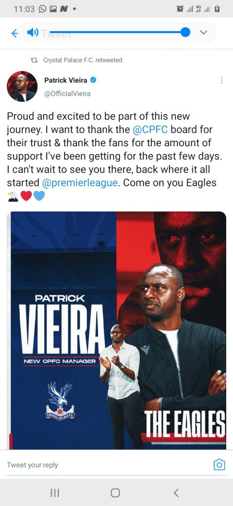 “Crystal Palace Football Club are delighted to confirm the appointment of Patrick Vieira as its new manager for the next three seasons,” Palace said in a statement.