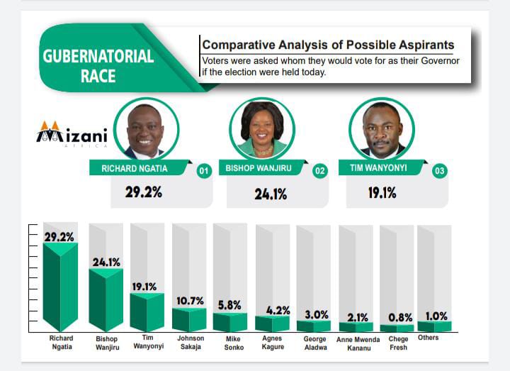 The poll, conducted between 5th and 12th January, 2022 in all 17 Constituencies in Nairobi, with a sample size of 2500 respondents placed Ngatia in front with 29.2 percent ahead of his closest rivals Bishop Margaret Wanjiru who polled 24.1 percent and Westlands Member of Parliament Tim Wanyonyi who had a rating of 19.1 percent.