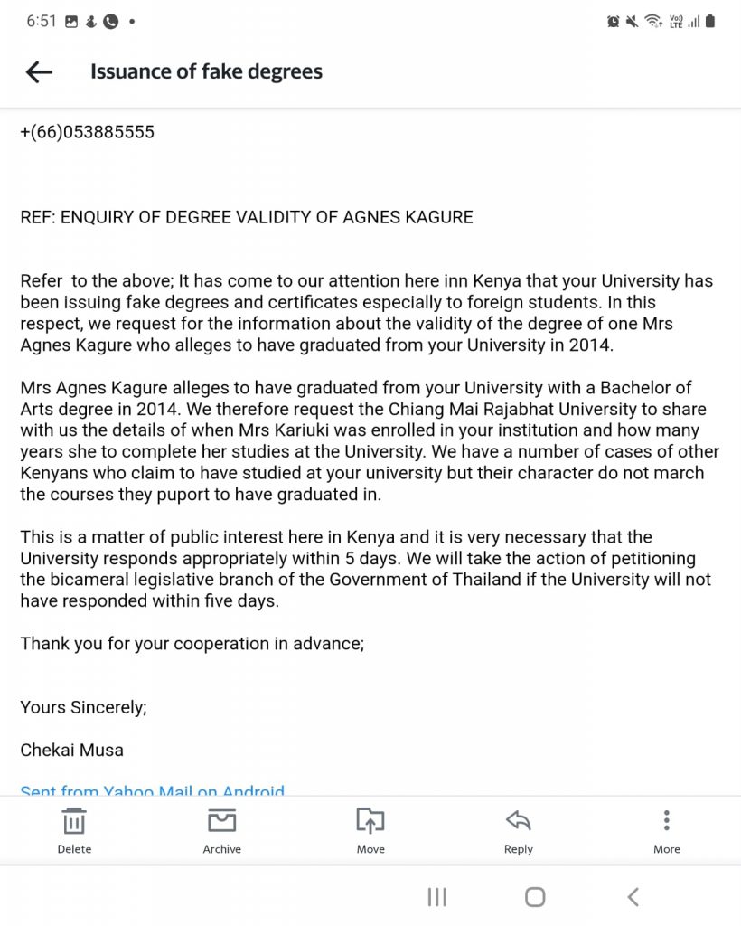 In the letter, Musa says:”Mrs Agnes Kagure alleges to have graduated from your university with a Bachelor of Arts Degree in 2014. We therefore request Chiang Mai Rajabhat University to share with us the details of when Mrs Kariuki was enrolled in your institution and how many she took to complete her studies at the university.”