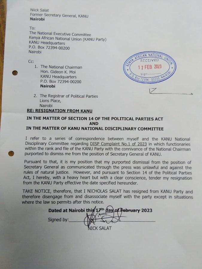 “Take notice, therefore, that I, Nicholas Salat, have resigned from the Kanu party and therefore disassociate myself with the party except in situations where the law permits after this notice,” he added.