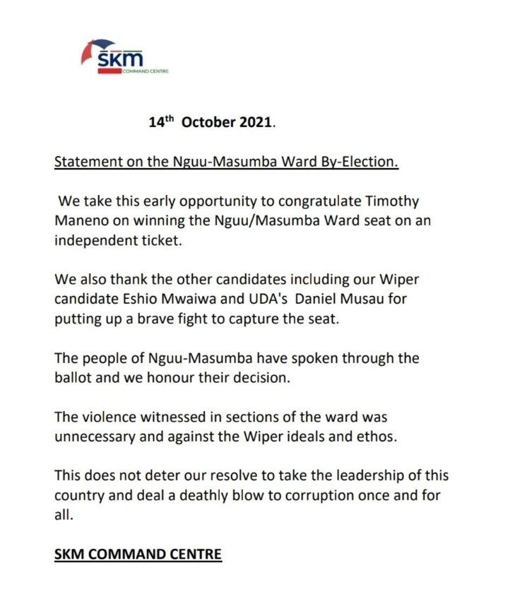 I congratulate the People of Nguu/Masumba Ward for their determination to uphold democracy. They have spoken loud and clear in electing Timothy Maneno. I thank all the gallant leader-volunteers who supported The Independent candidate. We have opened a new chapter in our politics.