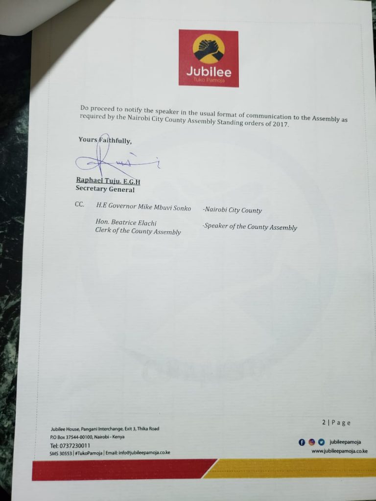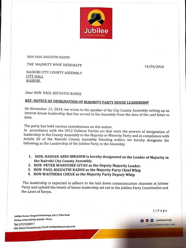 Based on the letter from Jubilee party and signed by the Secretary general, the party has effected changes in the house leadership!