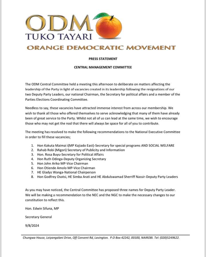 The Orange Democratic movement (O.D.M) the largest opposition political party in Kenya has made changes in its party leadership structure. This was occasioned by the nomination and subsequent appointments of its party big wigs into the government.