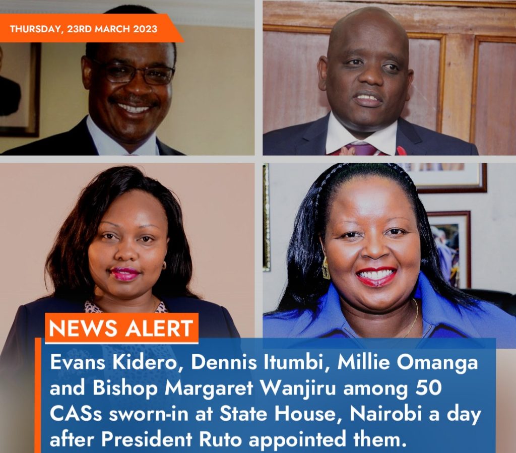 Former Nairobi Governor Dr. Evans Kidero, ex-Senate deputy Majority Whip Millicent Omanga, and former Starehe Member of Parliament Charles Kanyi Njagua joined the government as administrators when President William Ruto presided over the swearing-in of 50 Chief Administrative Secretaries at State House, Nairobi on Thursday morning, March 23, 2023.