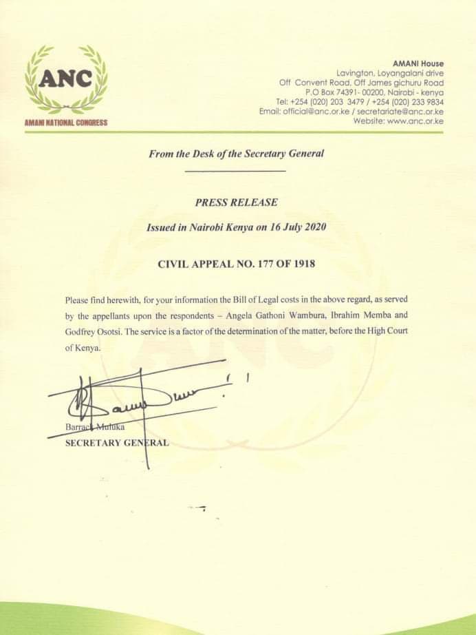 “The resignation of the outgoing ANC party national secretary general was procedural,” the bill, which was served to George Wandati and Company Advocates and Awele and Bashir Advocates, stated.