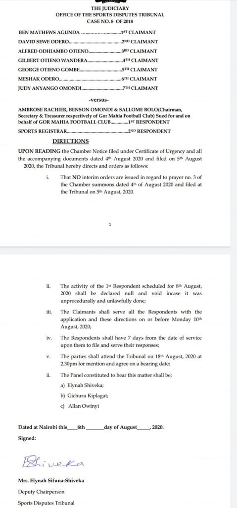 Ben Mathews Agunda, David Sewe Odero, Alfred Odhiambo Otieno, Gilbert Otieno Wandera, George Otieno Gombe, Meshack Odero, Judy Anyango Omondi being claimants in the above case, have moved to The sports dispute Tribunal court to stop the 8th August 2020 election a prayer that was granted by the court.