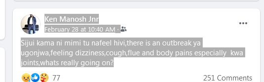 Sijui kama ni mimi tu nafeel hivi,there is an outbreak ya ugonjwa,feeling dizziness,cough,flue and body pains especially kwa joints,whats really going on?