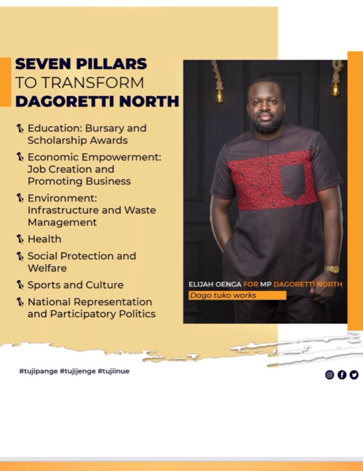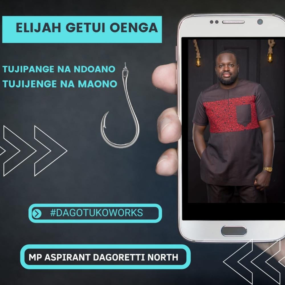I would love to go on and on, but I’ll just simplify this by proposing a solution. The good news is that in everything WE would love to be done in our Dago North, Elijah Oenga will tackle. This is evidemt from his manifesto that points out the issues, solutions and how the implementation will be done. Who openly does that? A leader with a heart of humanity, vision and is humble. I vouch for Elijah Getui Oenga as our MP 2022. (Kindly go through his manifesto www.dagotukoworks.co.ke) Be the narrative changer. Do not vote someone (who will give us something now and forget us later and kill our future) because of their big name, but vote for a do-er. One who sticks to his word. WE believe in Elijah Oenga.