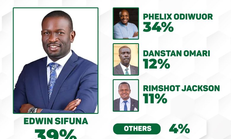 The survey places incumbent Senator Edwin Sifuna slightly ahead with 39 percent support, closely followed by Phelix Odiwuor, popularly known as Jalash, who registers 34 percent. Lawyer Danstan Omari polls 12 percent, while entertainment DJ Jackson, popularly known as DJ Rimshot, records 11 percent support.